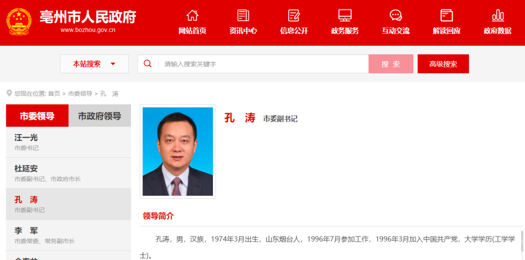 近日,亳州市人民政府網站“市委領導”一欄更新顯示,原任共青團安徽省委書記的孔濤,已任亳州市委副書記,陳軍不再擔任。