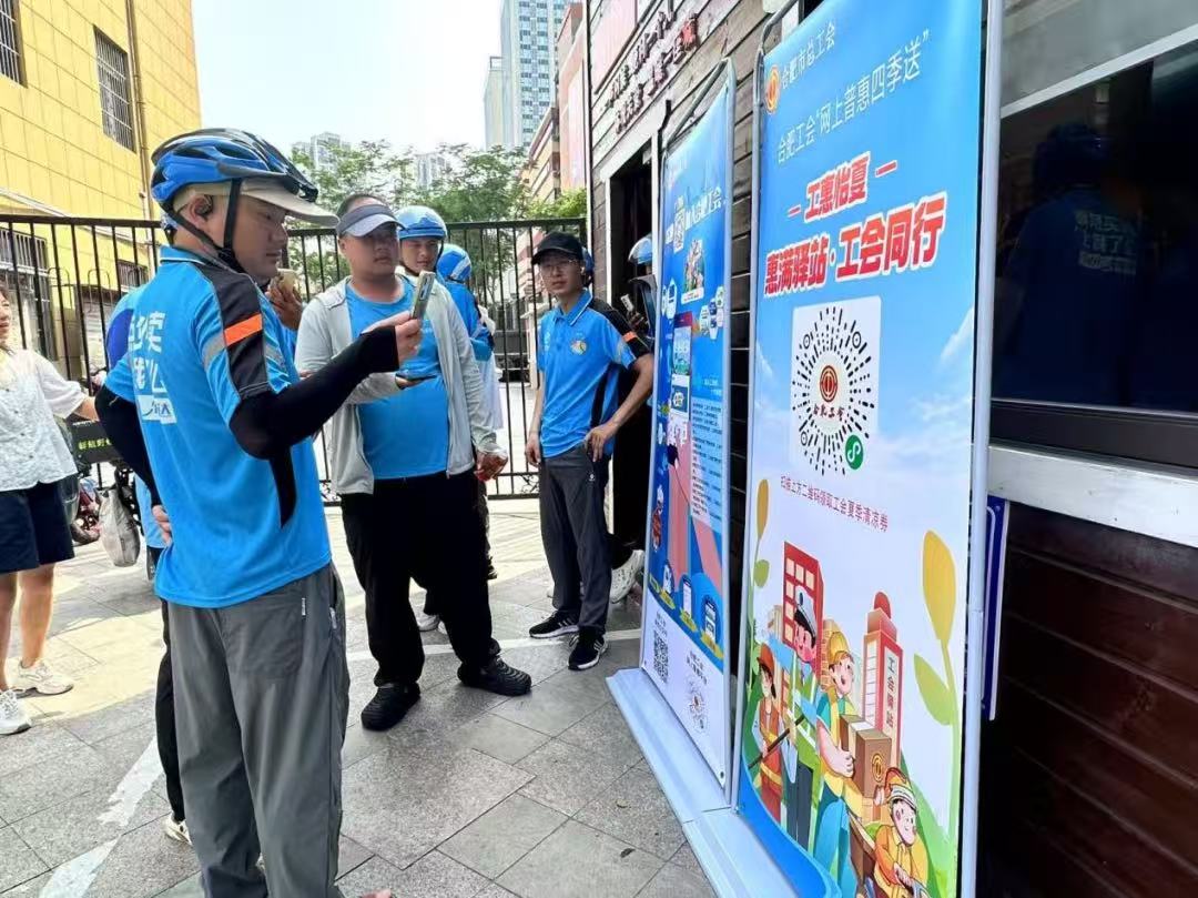 “中午太陽最毒的時候,我就來這兒歇會兒,喝瓶水再上路。”外賣員老楊常在此停靠,他說驛站雖小,卻解決了戶外勞動者的“急難愁盼”。如今,像這樣的工會驛站已成為城市里的“清涼港”,它們散布在街頭巷尾,既是高溫下的“降溫站”,也是勞動者的“補給點”。
