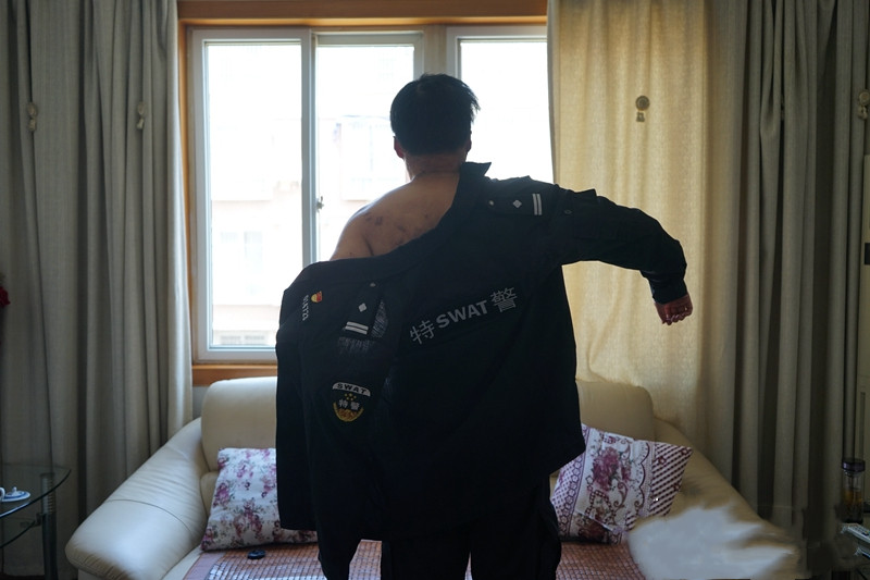 在父母家中,39歲的張劼摘下了彈力面罩,穿上了人字拖。但腰間勒緊的腰帶,和習慣性的挺拔站姿,讓他看起來依然颯爽。這樣的特警“版型”,在重大場合常能見到。