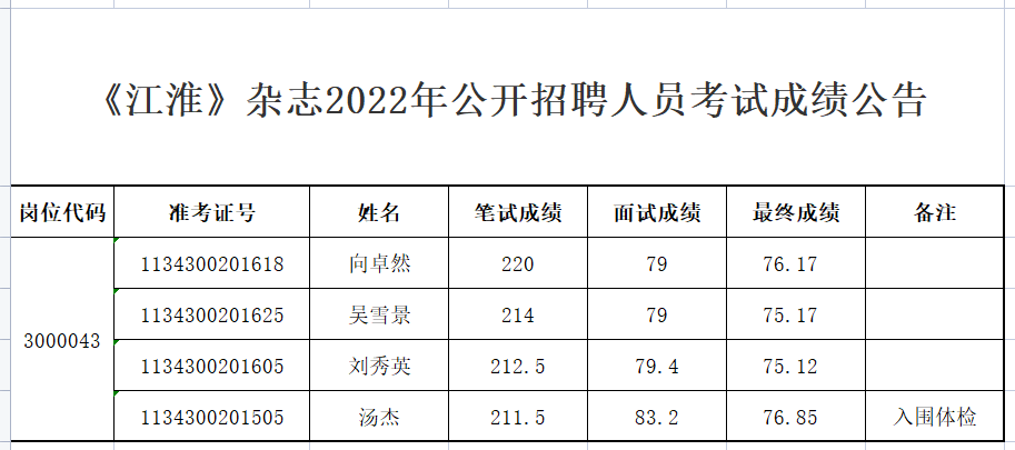 《江淮》雜志2022年公開招聘人員考試成績公告
