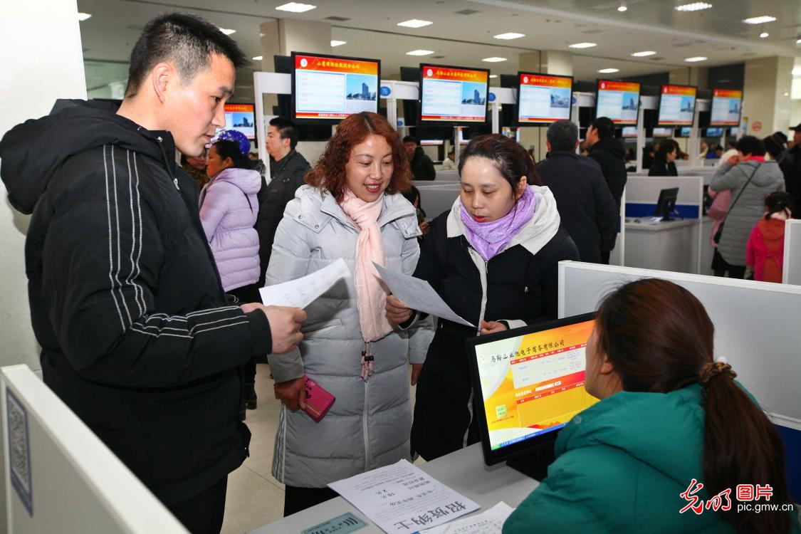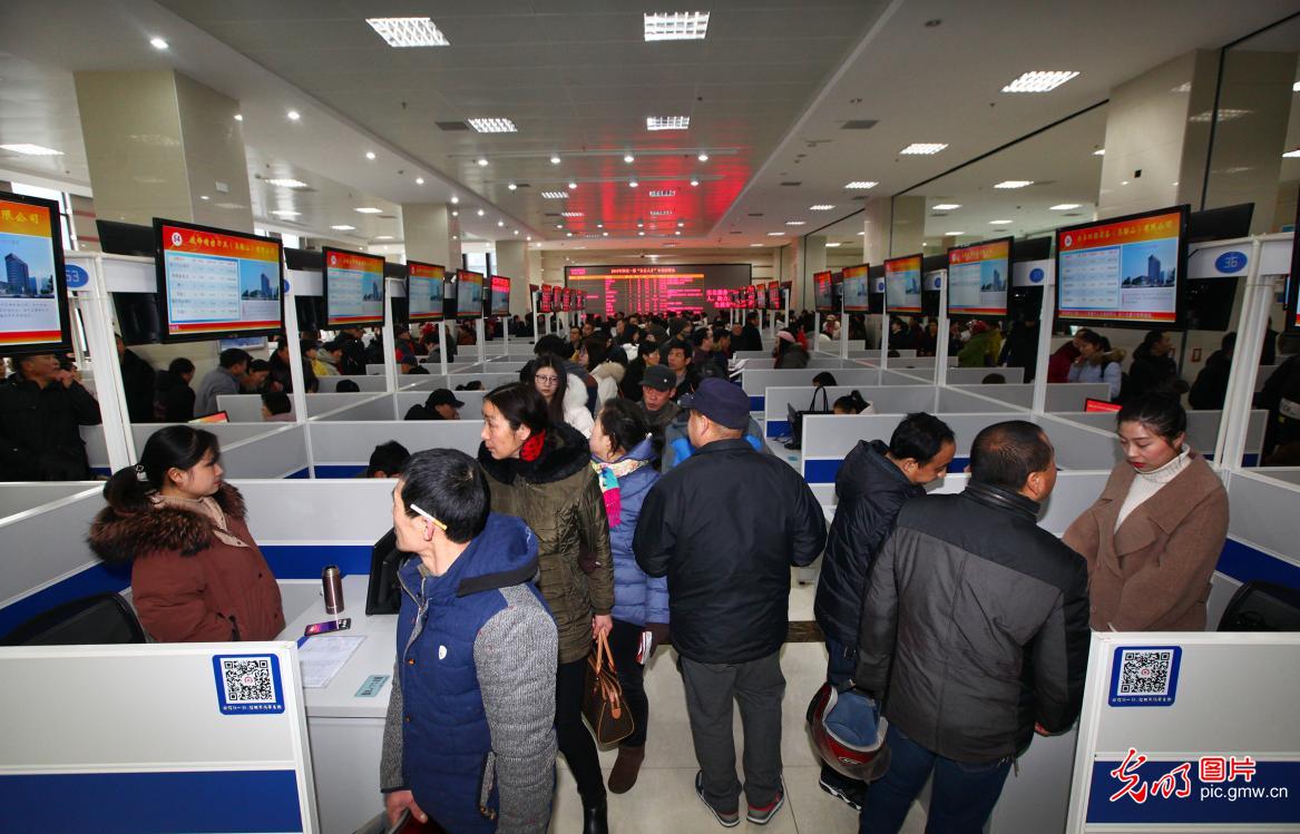 2019年2月19日,安徽省馬鞍山市2019年"四送一服"臺企人才專場招聘會在該市人力資源中心市場如火如荼地進行。招聘會現場人頭涌動,場面火爆。(王文生攝/光明圖片)