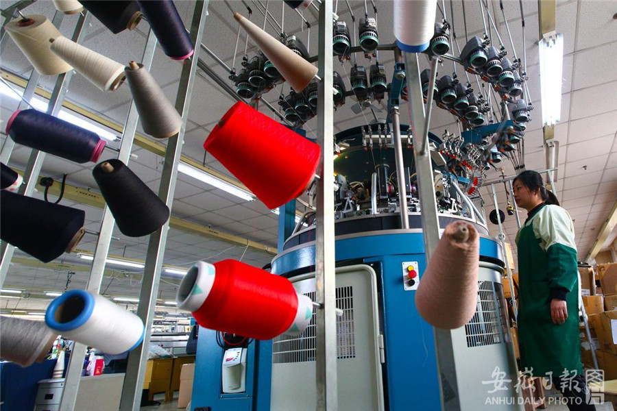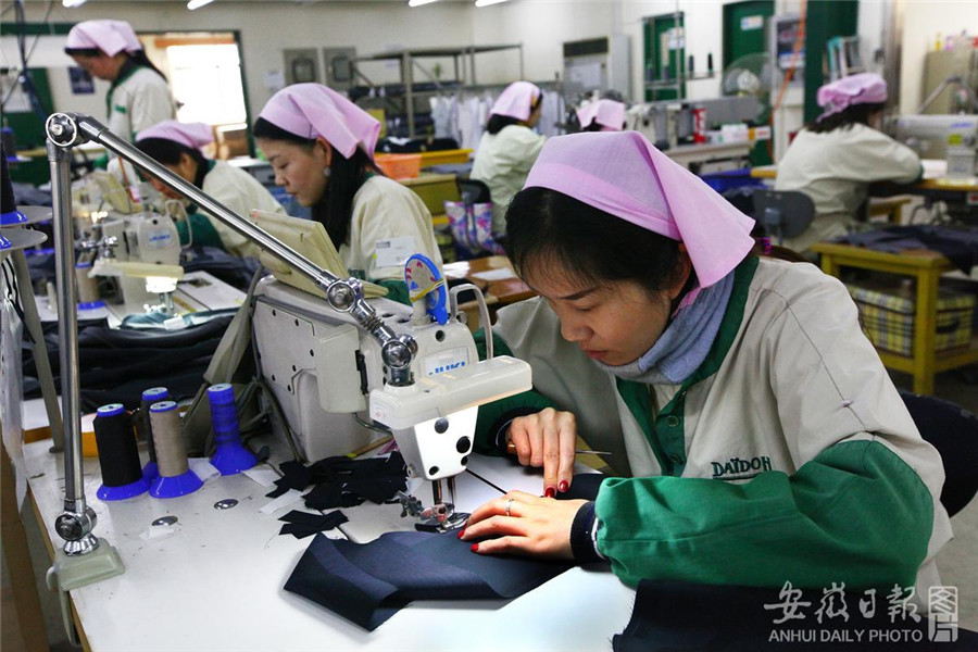 2月25日,馬鞍山經開區大同佳樂登(馬鞍山)有限公司員工在加工制作出口服裝。該公司產品90%出口到日本和歐美等國家和地區。今年以來,馬鞍山市進出口保持良好增長態勢,1月份,全市出口額達2.1億美元,同比增長65.2%,實現了開門紅。