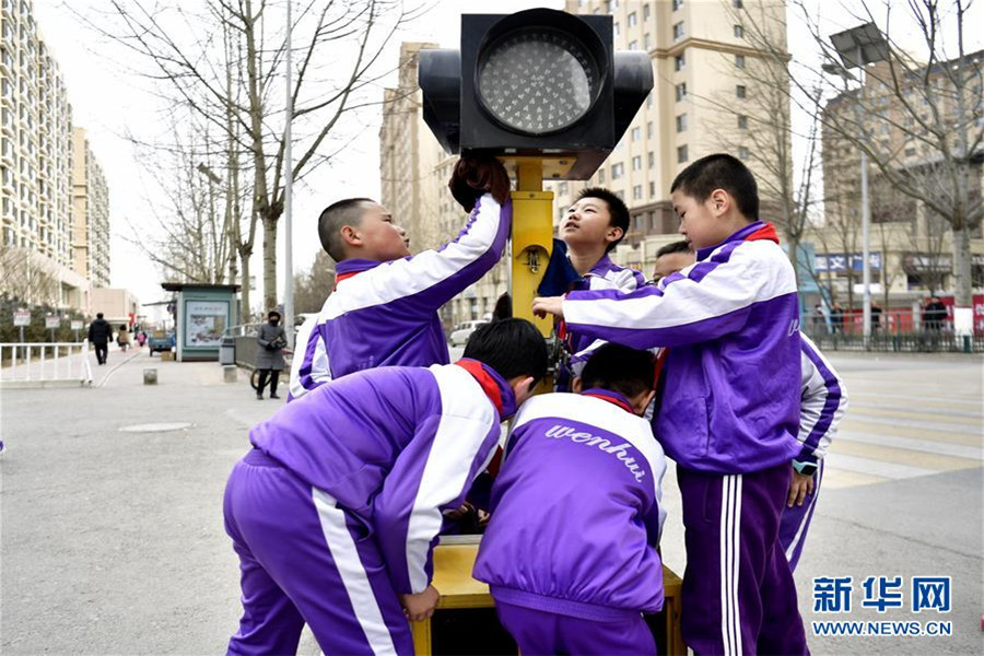 3月4日,青海省西寧市文匯小學啟動“心存大愛學雷鋒,從我做起見行動”主題教育活動,學生在學校附近清潔交通信號燈。