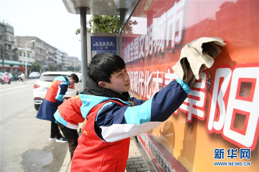 3月4日,中學生志愿者在安徽阜陽市文峰路公交車站臺擦洗站臺櫥窗。