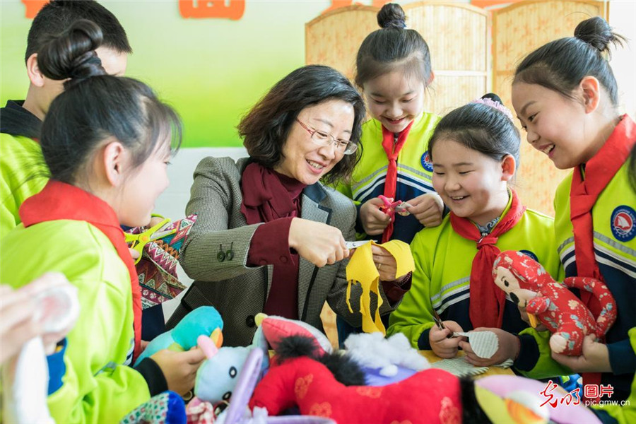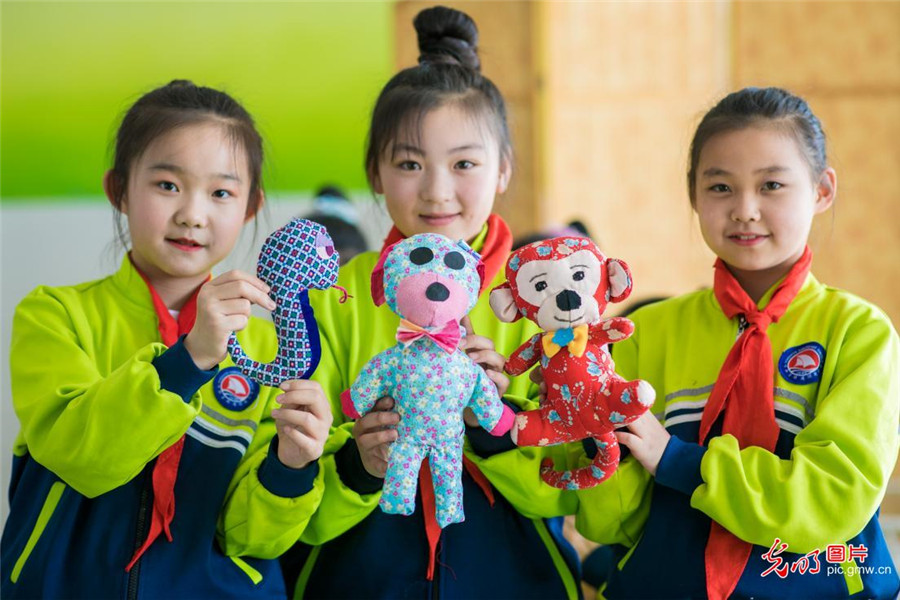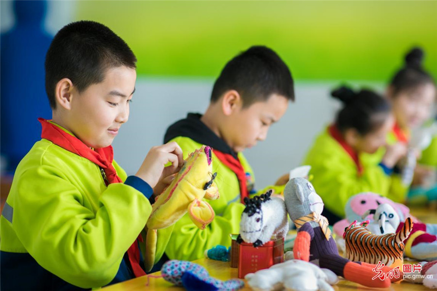 2019年3月18日,內(nèi)蒙古呼和浩特市玉泉區(qū)通順街小學(xué)開設(shè)宣傳低碳環(huán)保理念的手工小課堂,孩子們在老師的帶領(lǐng)下,利用身邊的廢舊布頭,絲綿、紐扣等制作小布藝作品,培養(yǎng)孩子們勤儉節(jié)約和低碳環(huán)保的意識。(丁根厚攝/光明圖片)