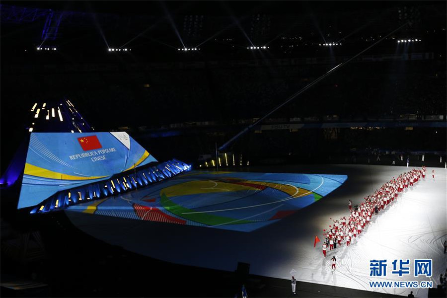 7月3日,中國大學(xué)生體育代表團在開幕式上入場。 當(dāng)日,第30屆世界大學(xué)生夏季運動會在意大利那不勒斯開幕。 新華社記者鄭煥松攝