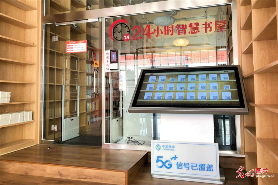 2019年7月2日,河北雄安新區(qū)容城縣新華書店。近日,由河北移動聯(lián)合新華書店打造的24小時5G無人智慧書店在雄安新區(qū)容城縣新華書店成功試點(diǎn)運(yùn)營,為顧客創(chuàng)造了更便捷、更智慧的購書、閱讀體驗。(賈昕曈攝/光明圖片)