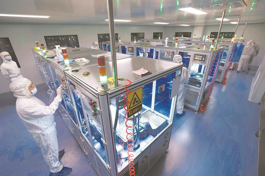 4月9日,必歐瀚生物技術(合肥)有限公司工人在生產抗原檢測試劑產品。合肥市多措并舉,保障口罩、防護服、抗原檢測試劑盒、新冠病毒疫苗等企業開足馬力生產,助力疫情防控。