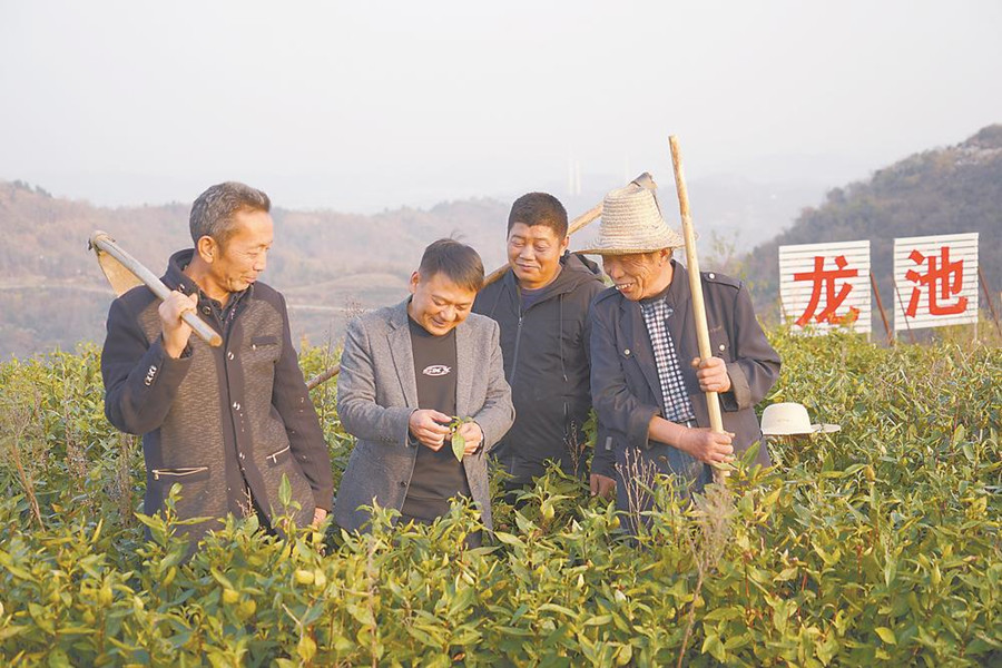 近日,懷寧縣清河鄉人大代表、龍池村黨總支書記陳衛中(左二)在茶園里向茶農傳授茶樹過冬要領。近年來,他帶領群眾通過流轉荒山,將茶園種植面積發展到2000余畝,成為村集體和村民增收致富的支柱,走出了一條“茶旅融合、以茶帶富”的鄉村振興之路。