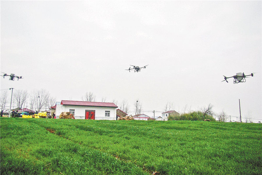 2月26日,淮南市壽縣雙廟集鎮周崗村方郢組1300畝小麥種植地里,卓越糧食種植專業合作社組織植保無人機,對小麥開展春管。通訊員 萬前進 攝