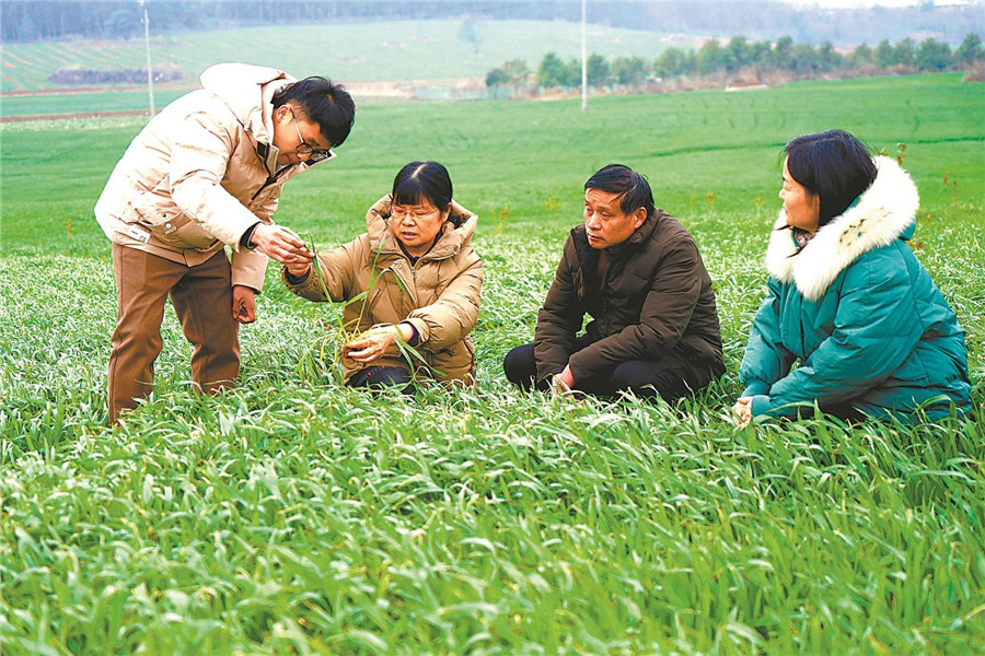 2月26日,懷寧縣月山鎮奇隆村,農技專家深入麥田指導農戶春耕春管,為農業穩產保供打下堅實基礎。通訊員 檀志揚 攝