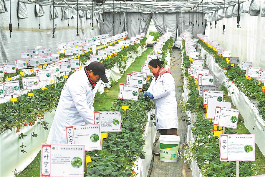 2月20日,安徽省級草莓種質資源圃,長豐縣農業技術推廣中心工作人員在進行疏花疏果田間作業。通訊員 袁兵 攝