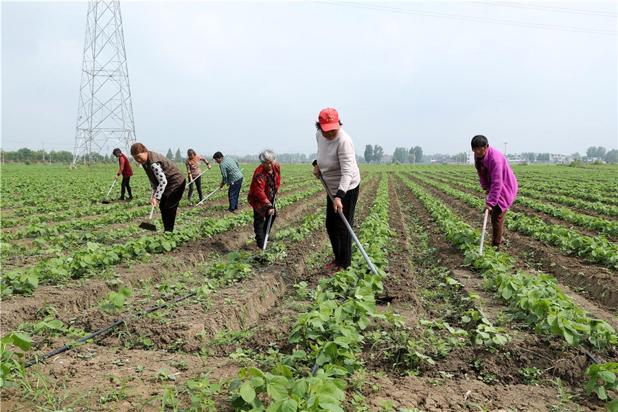 5月5日,蒙城縣小辛集鄉李大塘村農民正在田間勞作,清除大豆田里的雜草。立夏時節,該縣鄉村田間地頭到處是一派忙碌景象。 通訊員 胡衛國 攝