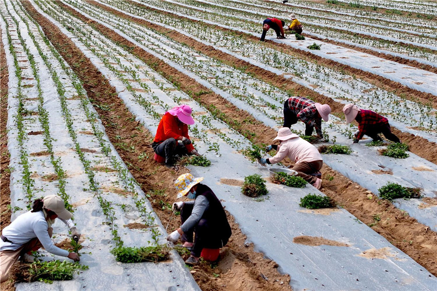5月5日,在亳州市譙城區十八里鎮蔣李村,農民在田間栽植菊花。當日是立夏節氣,當地農民搶抓農時,進行菊花的移栽、澆水等工作。 通訊員 劉勤利 攝