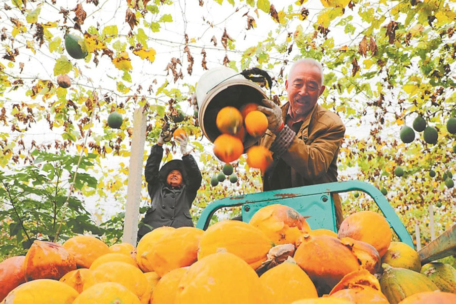 10月19日,阜陽市潁東區(qū)口孜鎮(zhèn)焦莊村瓜蔞種植基地,村民在采收成熟的瓜蔞。近年來,該區(qū)大力發(fā)展瓜蔞種植產(chǎn)業(yè),延伸拓展產(chǎn)業(yè)鏈,促進農(nóng)業(yè)增效、農(nóng)民增收。