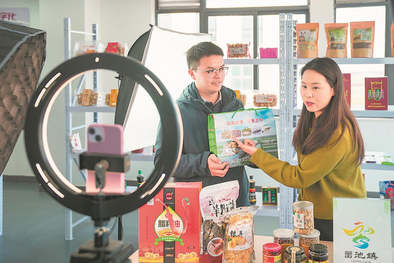 1月10日,望江縣雷池鎮雷江村主播在網絡帶貨。該鎮積極推進“一村一品”,在全鎮12村建立12個直播間,以“短視頻+直播”模式,推介當地的雜糧、有機果蔬、農家小吃等特產。 記者 李博 攝