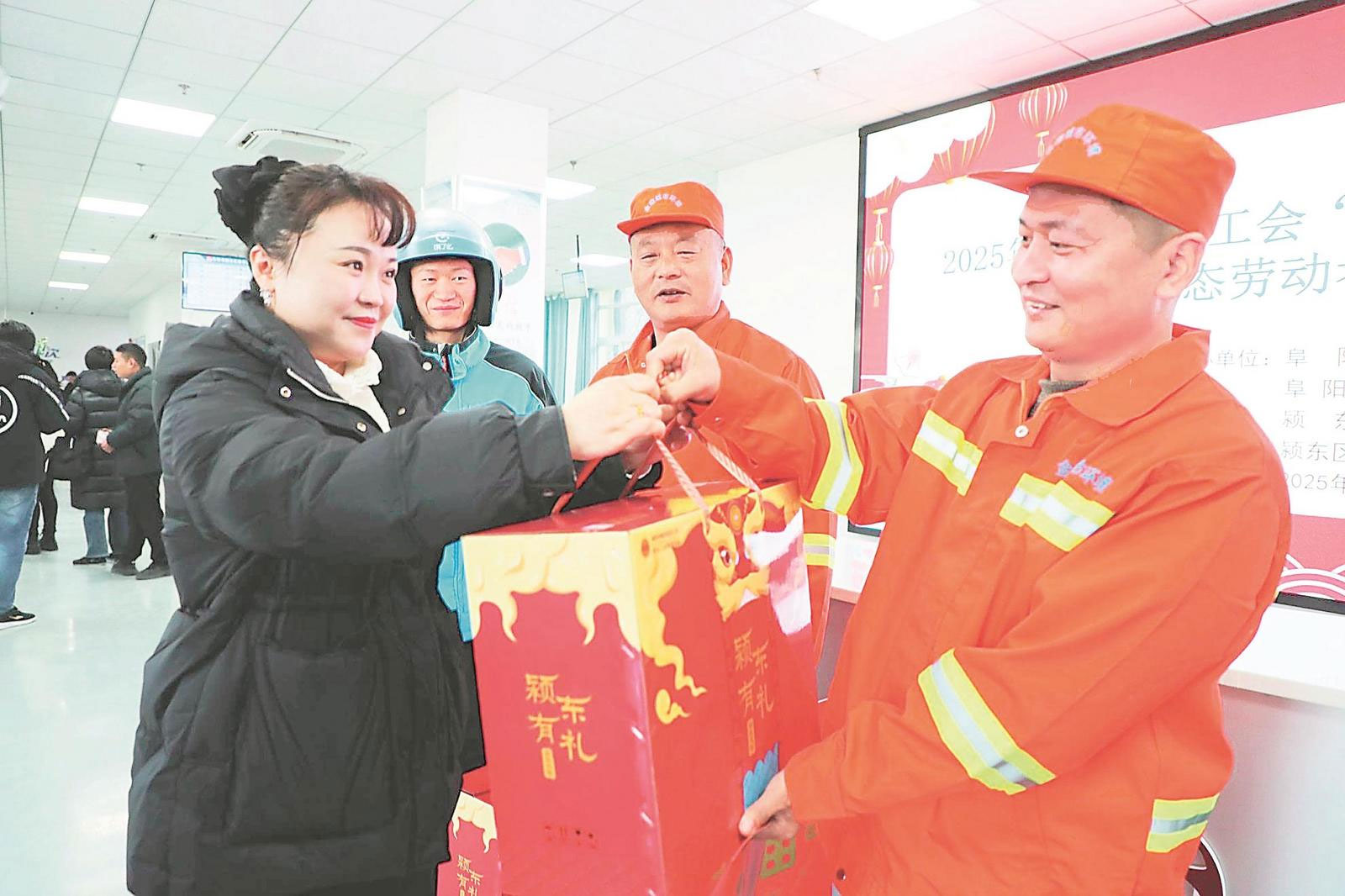 1月17日,在阜陽(yáng)市潁東區(qū)數(shù)據(jù)資源管理局工會(huì)驛站,工作人員為戶(hù)外勞動(dòng)者發(fā)放新年大禮包。當(dāng)日,阜陽(yáng)市總工會(huì)等部門(mén)開(kāi)展走訪(fǎng)慰問(wèn)活動(dòng),為戶(hù)外勞動(dòng)者送上冬日里的暖心關(guān)懷。通訊員 宿飛 趙錦萱 攝