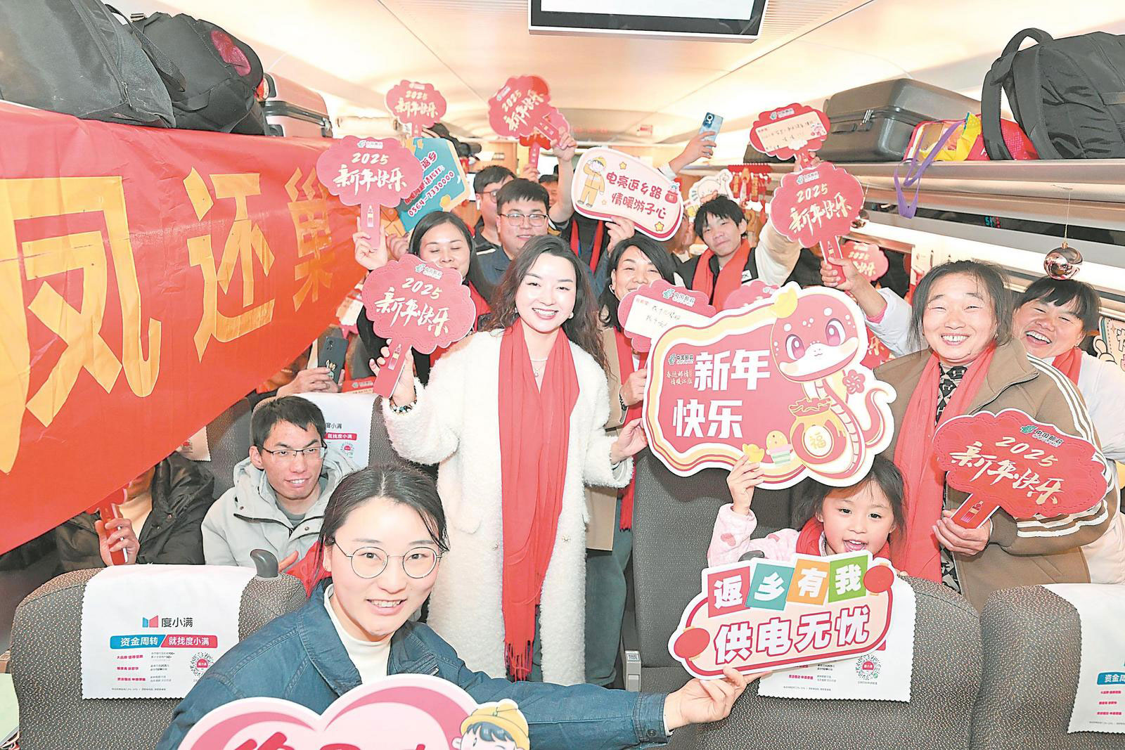 1月22日,第七屆“春運(yùn)郵情,情暖江淮”關(guān)愛(ài)外出務(wù)工創(chuàng)業(yè)人員大型公益活動(dòng)專(zhuān)列、專(zhuān)廂滬蘇浙三地首發(fā)車(chē)從上海松江發(fā)往安徽金寨,536名返鄉(xiāng)人員在列車(chē)上歡慶小年夜。記者 張大崗 攝