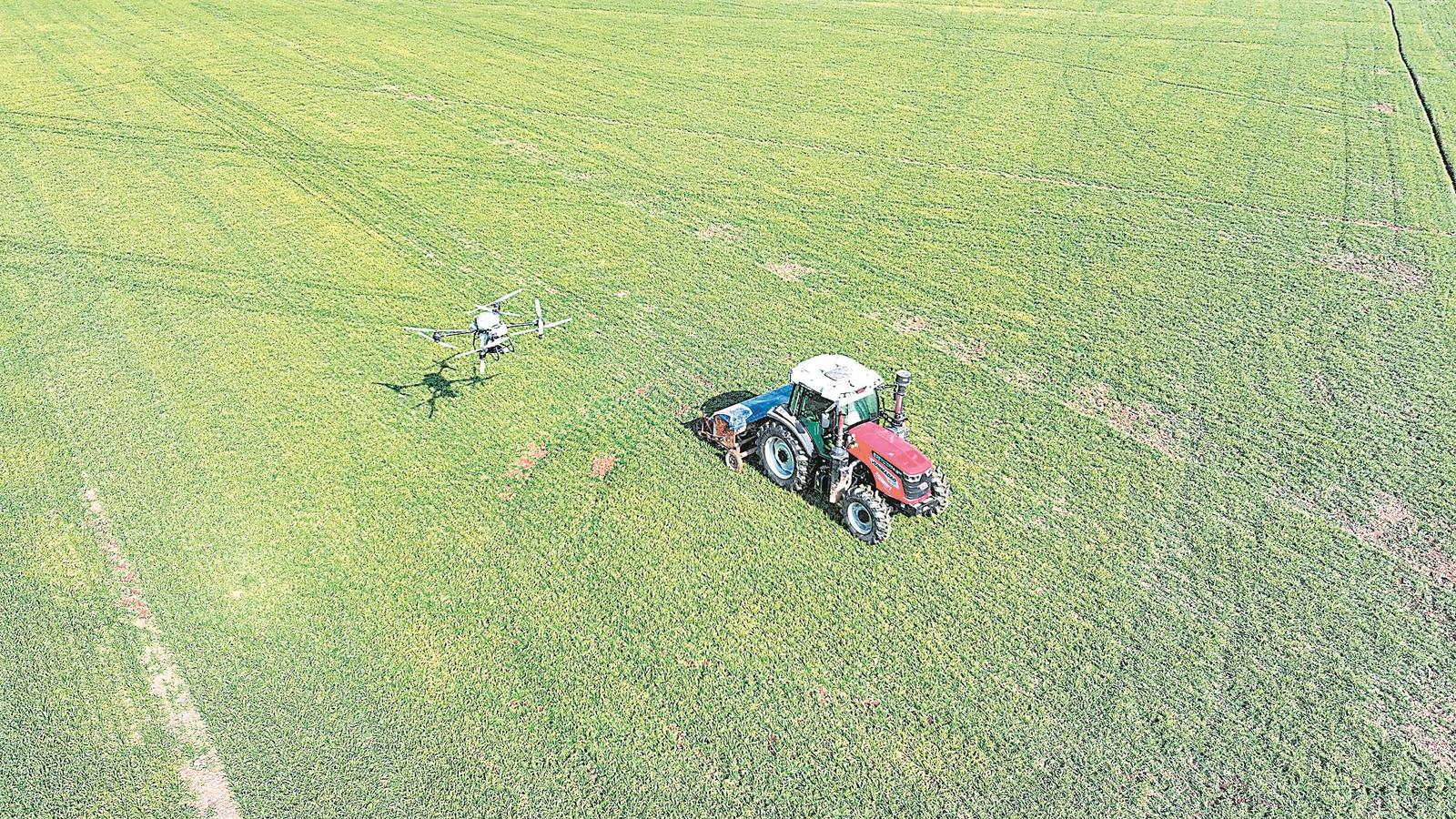2月4日,蚌埠市五河縣頭鋪鎮東來家庭農場,農民操作農機和無人機給小麥施肥。 通訊員 李向前 攝