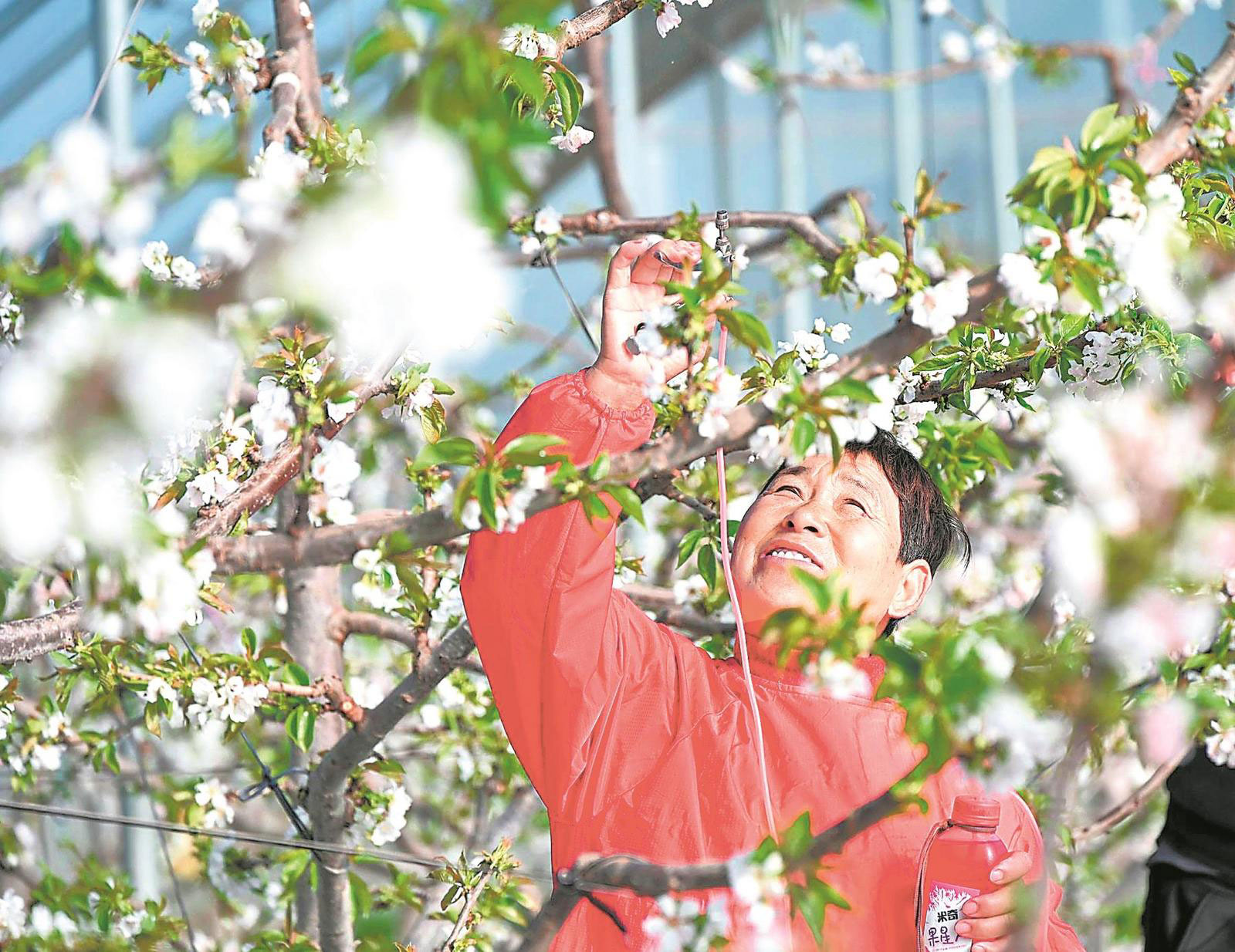 2月7日,宿州市碭山縣李莊鎮鎮東村果農在車厘子大棚內為花朵進行人工授粉。通訊員 崔猛 攝