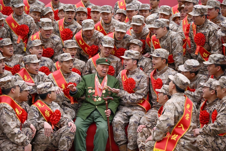 在安徽省合肥市國(guó)防動(dòng)員訓(xùn)練基地,抗戰(zhàn)老兵宣鉅華與新兵一起高唱《強(qiáng)軍戰(zhàn)歌》。(徐偉攝影)