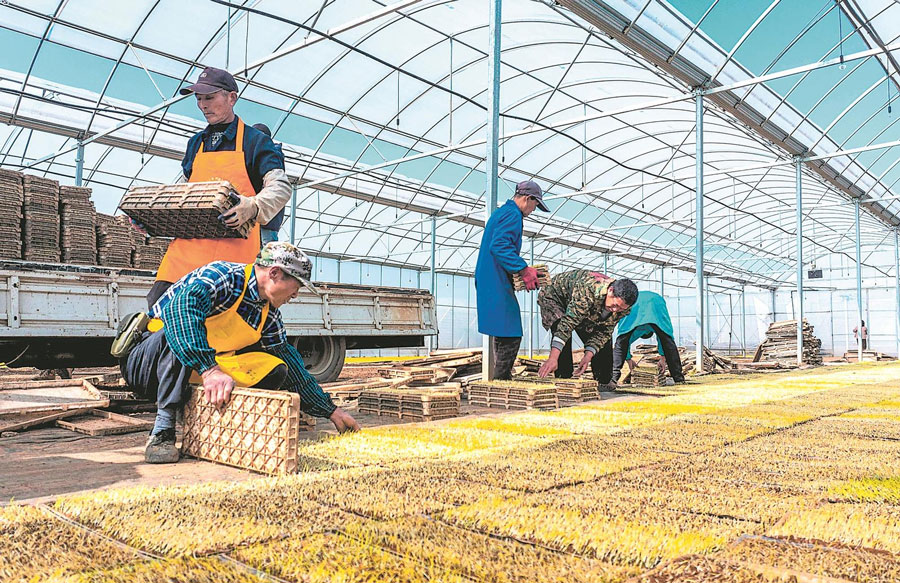 3月19日,合肥市廬江縣郭河鎮廣寒村天壤水稻種植合作社的育秧工廠大棚里,農民在擺放秧盤進行工廠化集中育秧。目前,當地春耕生產全面鋪開。通訊員 左學長 攝