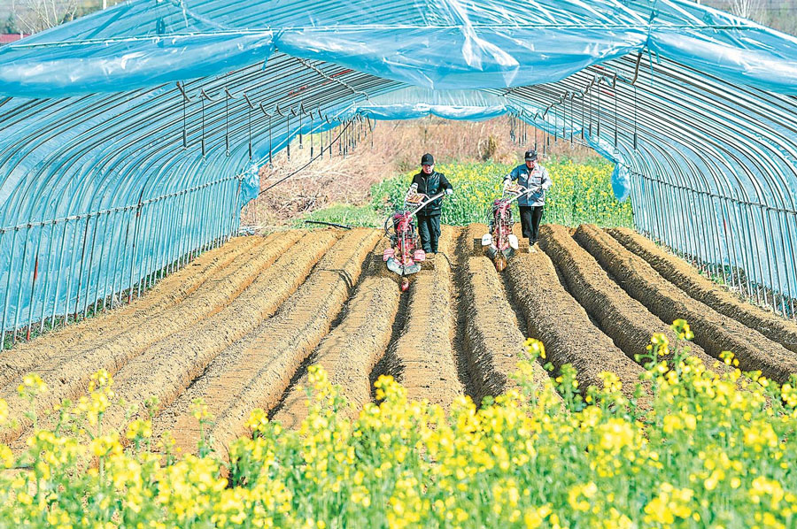 3月17日,在銅陵市義安區天門鎮一處種植白姜的大棚里,姜農正在操控起壟機對姜田進行挖溝起壟,為銅陵白姜的春種做準備。 通訊員 儲著傳 攝