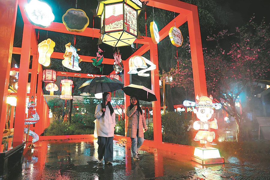 3月28日晚,游客撐傘在齊云山腳下的商業街漫步,雨中賞花燈。黃山市休寧縣齊云山風景區腳下的齊云小鎮以非遺為筆、山水為紙,繪就傳統與現代交融的文旅新篇。記者 王蘭蘭 攝