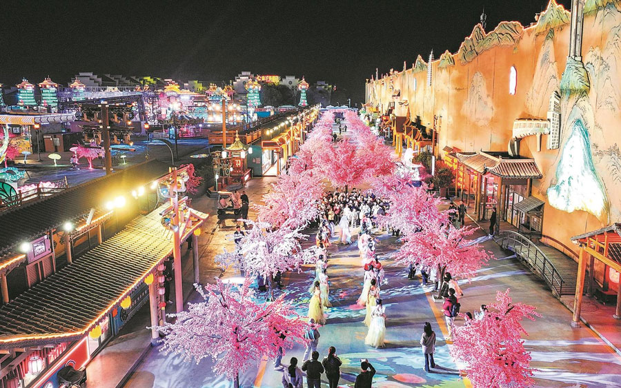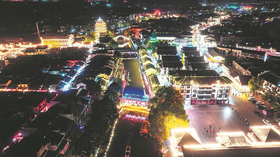 3月28日晚,肥西縣三河古鎮流光溢彩。三河古鎮通過全息影像等新技術打造“三河明月夜”,全力開拓古鎮夜游經濟,為游客帶來全新的夜間游覽體驗。記者 張大崗 劉靜文 攝