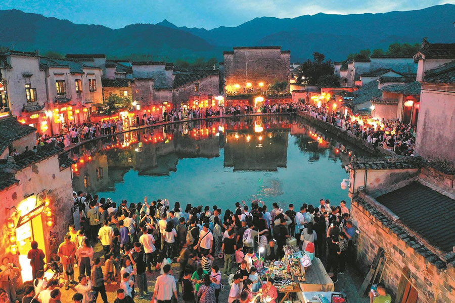 5月2日晚,黃山市黟縣宏村景區燈火璀璨,游客徜徉古村,品美食、賞夜景,樂享“五一”假期。通訊員 許家棟 攝