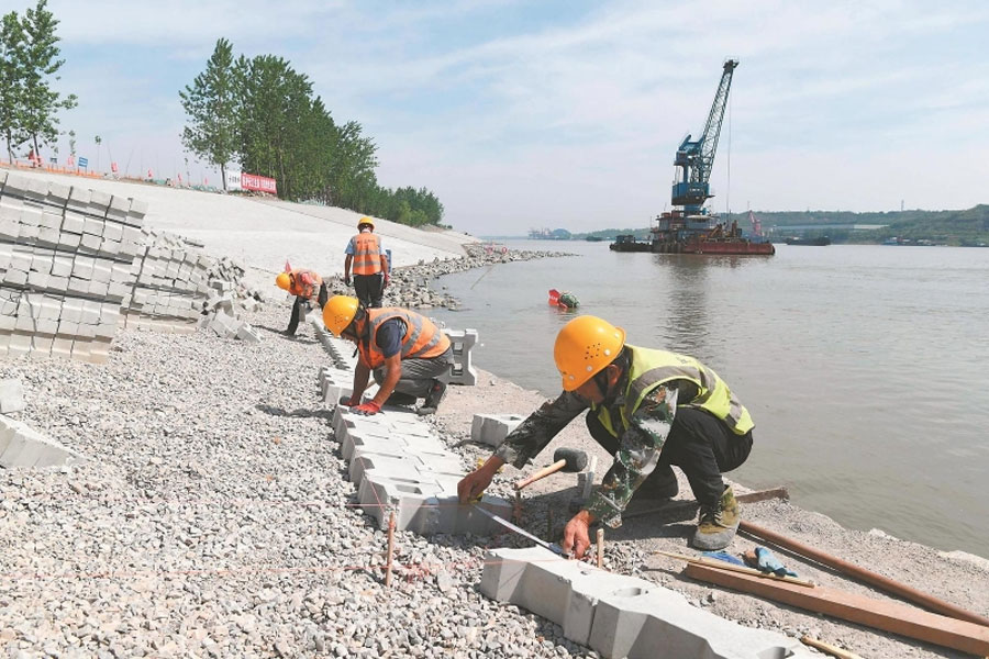 5月13日,施工人員在長江銅陵河段綜合治理工程老洲鄉(xiāng)堤岸邊砌筑護坡,確保已開工長江堤岸在今年長江汛期到來之前完工,發(fā)揮效益。