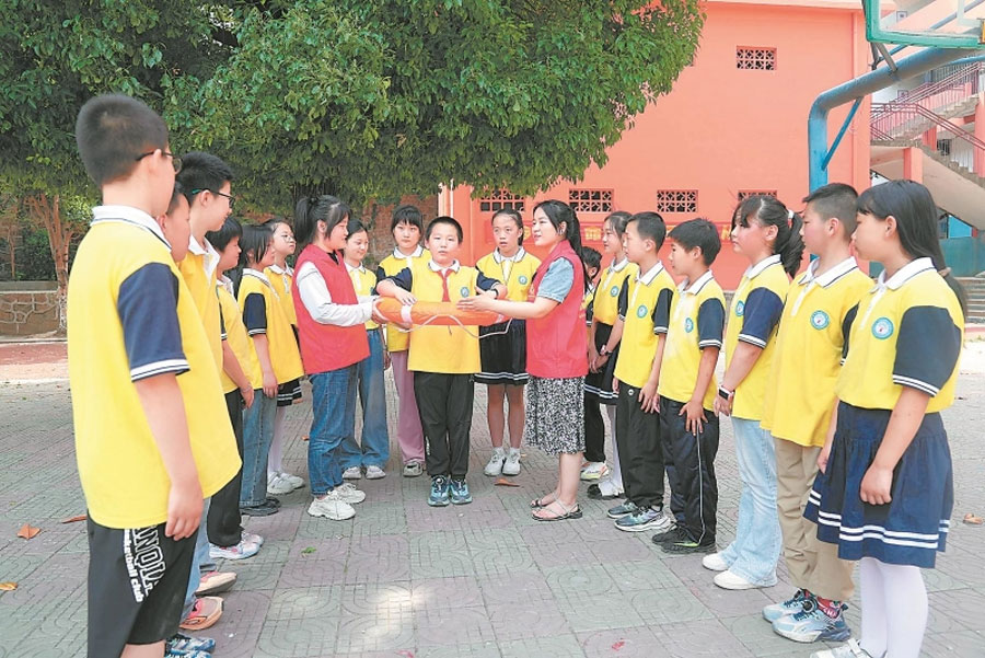 5月14日,樅陽縣樅陽小學,志愿者在講解和演示專業救生圈的使用方法。連日來,樅陽縣各中小學校組織開展“防溺水 護安全”活動,提升學生防溺水安全意識。