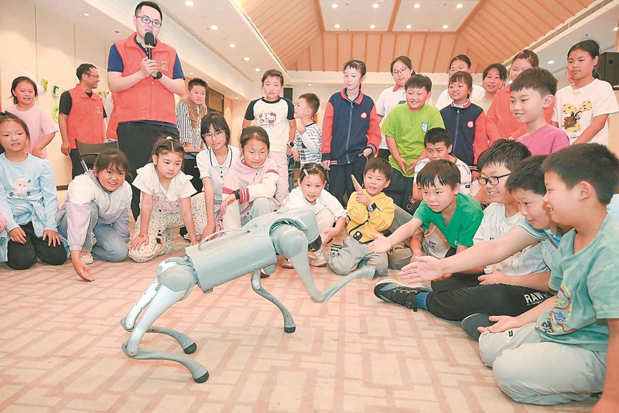 近日,在馬鞍山市和縣科技館,來自功橋鎮(zhèn)的30名學(xué)生正在與“機(jī)器狗”進(jìn)行現(xiàn)場(chǎng)互動(dòng),感受科技的魅力。通訊員 秦祖泉 攝