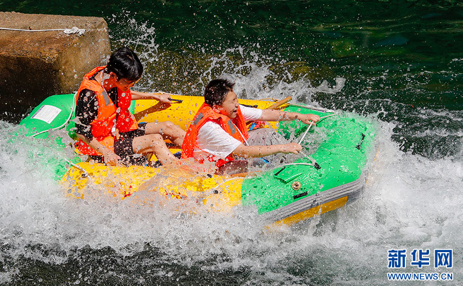 7月7日,游客在安徽省黃山市休寧縣夾溪河親水漂流。