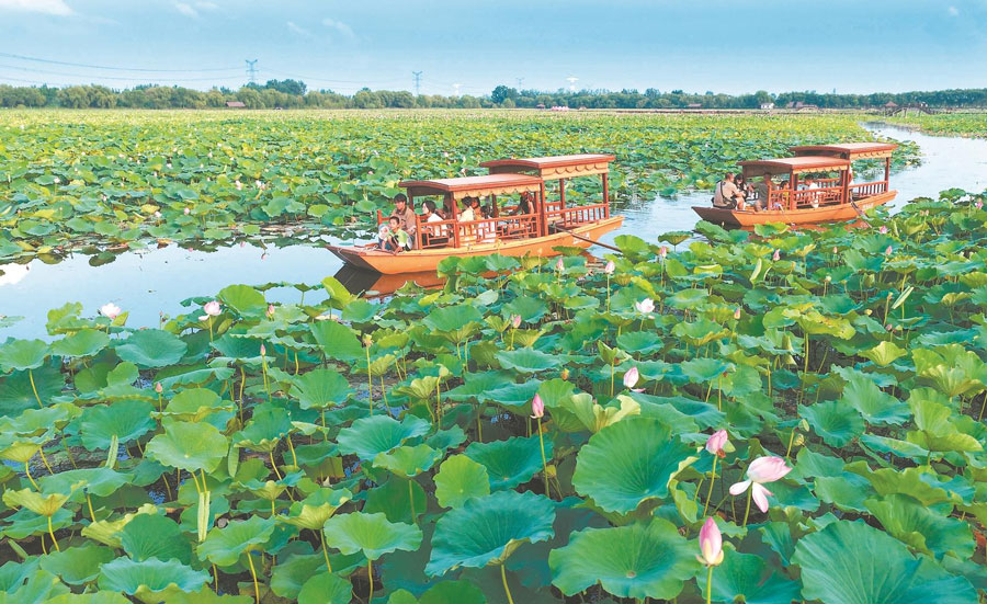 7月20日,淮南市毛集實(shí)驗(yàn)區(qū)焦崗湖國家濕地公園的荷花淀,游人乘船觀賞荷花。當(dāng)日是入伏第一天,許多市民和游客來此親水、消暑、賞荷花。據(jù)了解,焦崗湖是淮河流域天然淺水湖泊,濕地面積6萬畝,生物資源豐富,數(shù)百種野生動植物繁衍于此,被譽(yù)為“淮河大濕地,華東白洋淀”。入夏以來,萬畝荷花競相開放,形成了獨(dú)特的生態(tài)奇觀。記者 李博 攝/視覺安徽