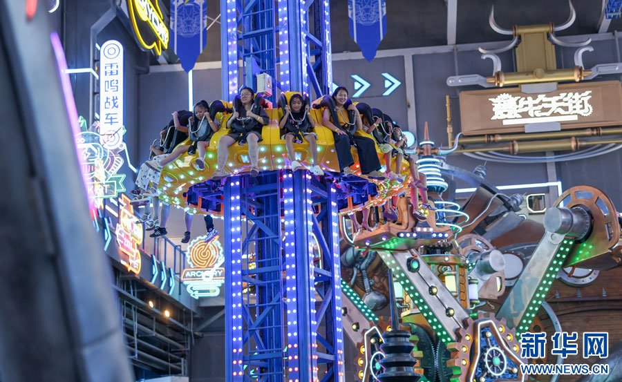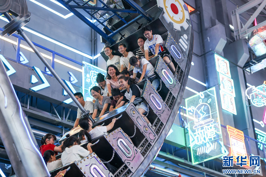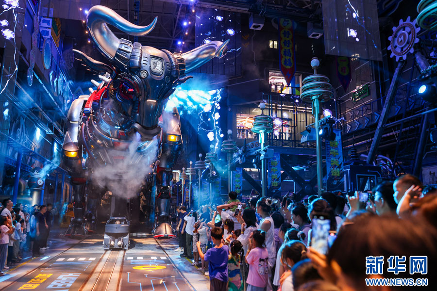 ??今年暑期,位于安徽省淮北市相山區的機械巨獸IP主題街區夔牛天街人潮涌動,曾經轟鳴半個世紀的老電廠化身為融合科技、藝術與工業美學的奇幻空間,吸引眾多游客前來體驗游玩。新華網發(王文 攝)