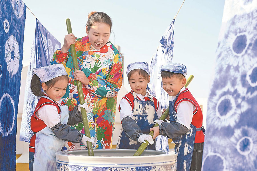 11月11日,在合肥市大西門幼兒園教育集團固鎮路分園,小朋友們在學習體驗非遺扎染技藝。通訊員 趙明 攝