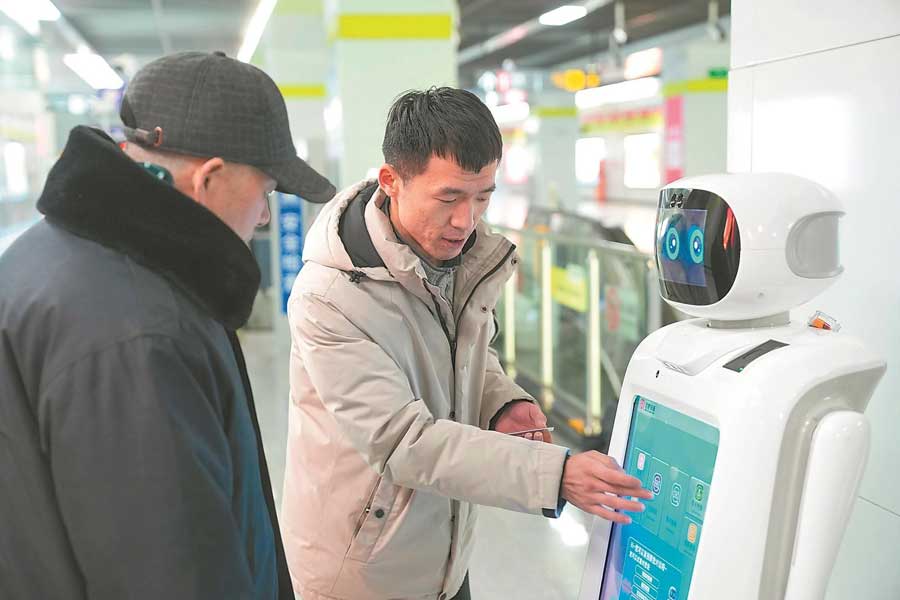 1月31日,云谷路站E進站口內,票務機器人“迪仔”在為旅客提供售票服務。