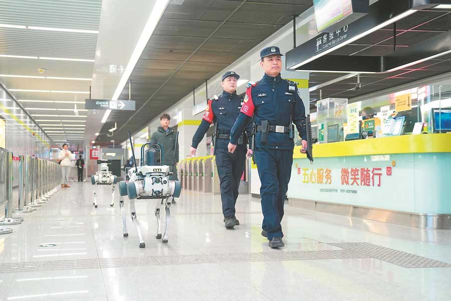 1月31日,在云谷路站,警用機器狗“靚仔”和“虎子”不時以語音提醒旅客注意安全。
