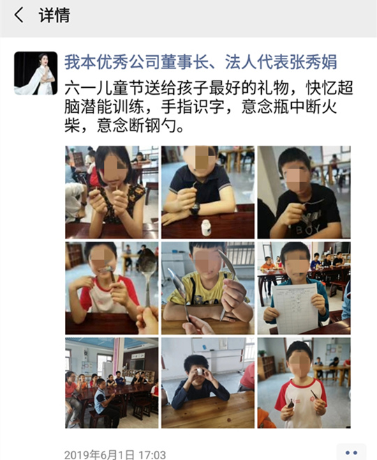 2019年7月12日,張秀娟在朋友圈曬出學(xué)員的成績(jī):做到了手心識(shí)字,信封透視字卡,意念搬運(yùn)密封瓶里的鈔票、別針、巧克力,意念斷鋼勺。