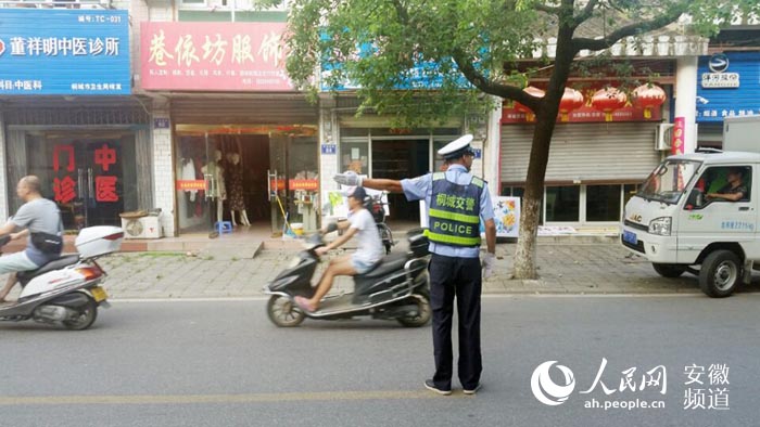 桐城交警楊大偉在六尺巷一帶疏導(dǎo)交通,“空白罰單”就是在此位置開出。