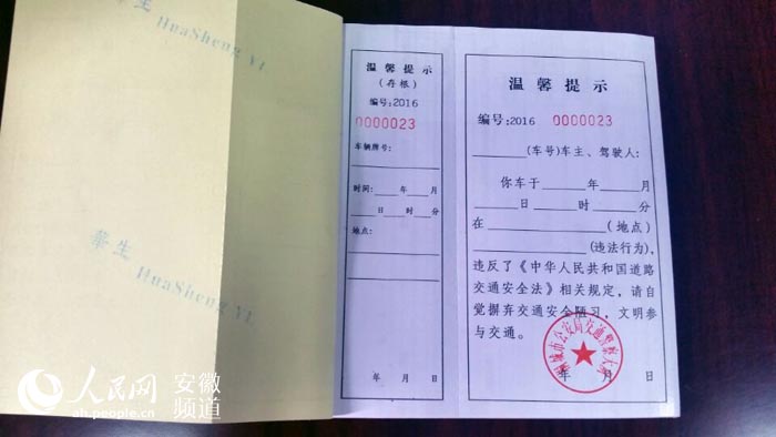 桐城交警大隊(duì)新印制的“溫馨提示單”,用于對駕駛員首次輕微違法進(jìn)行提醒。