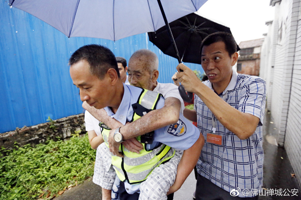 9月16日中午,佛山禪城公安張槎派出所民警李勝奇到禪城區張槎九江基開展安全巡查時,發現不少老房子還住有多位獨居老人,有的老人還患病,腿腳行動不便。為了保證他們的安全,民警李勝奇多次折返,逐個背起獨居病患老人,徒步把他們及時轉移到安全的臨時庇護場所。