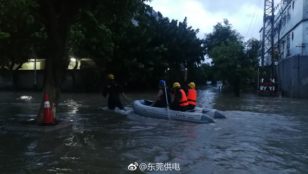 9月16日18時30分,東莞市洪梅鎮出現海水倒灌,造成鎮街嚴重水浸。由于車輛無法到達,洪梅供電分局搶修人員通過沖鋒舟趕赴現場,消除隱患缺陷,確保群眾用電。