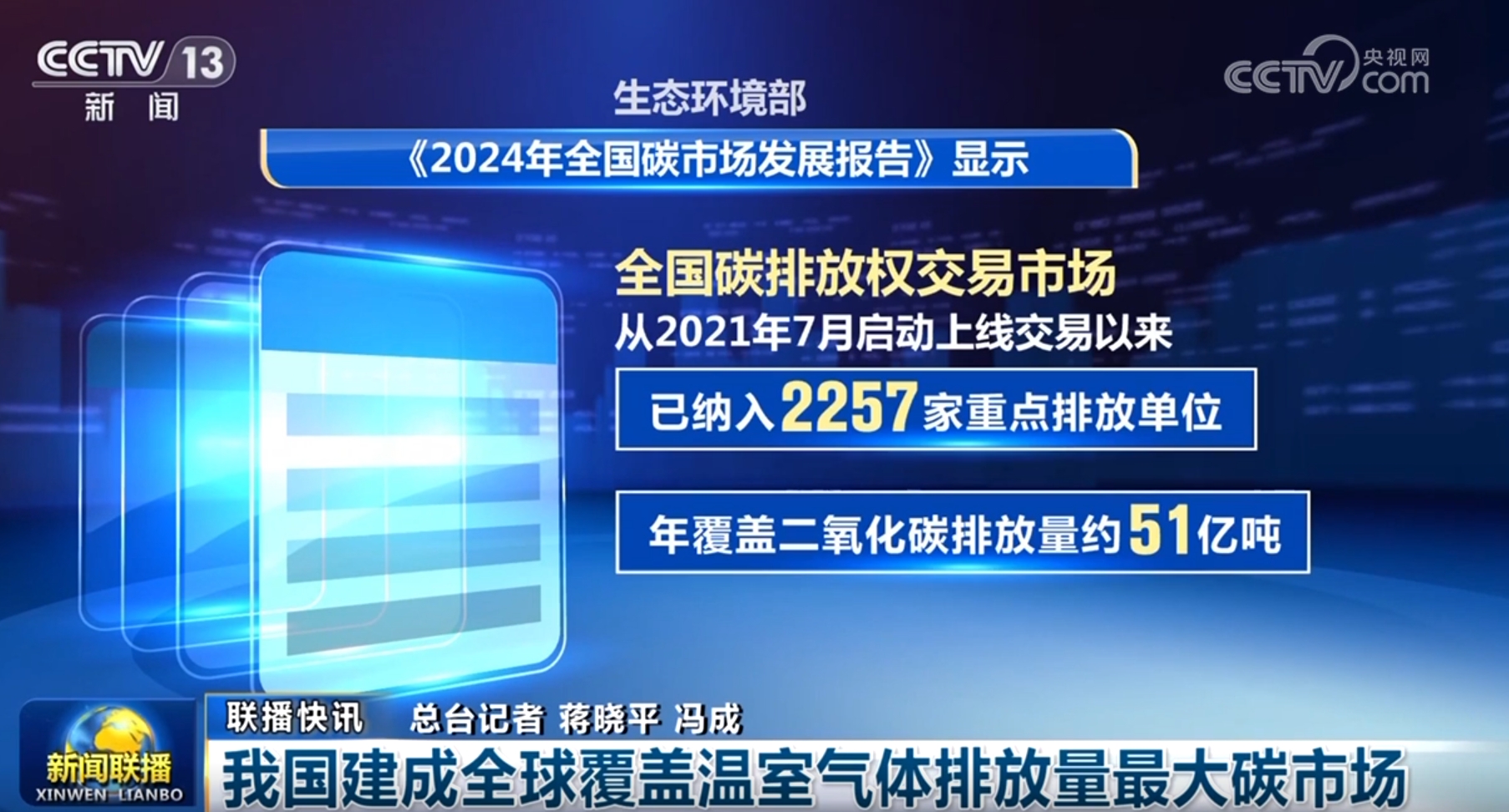 生態環境部最新發布的《2024年全國碳市場發展報告》顯示,全國碳排放權交易市場從2021年7月啟動上線交易以來,已納入2257家重點排放單位,年覆蓋二氧化碳排放量約51億噸。我國已成為全球覆蓋溫室氣體排放量最大的碳市場。