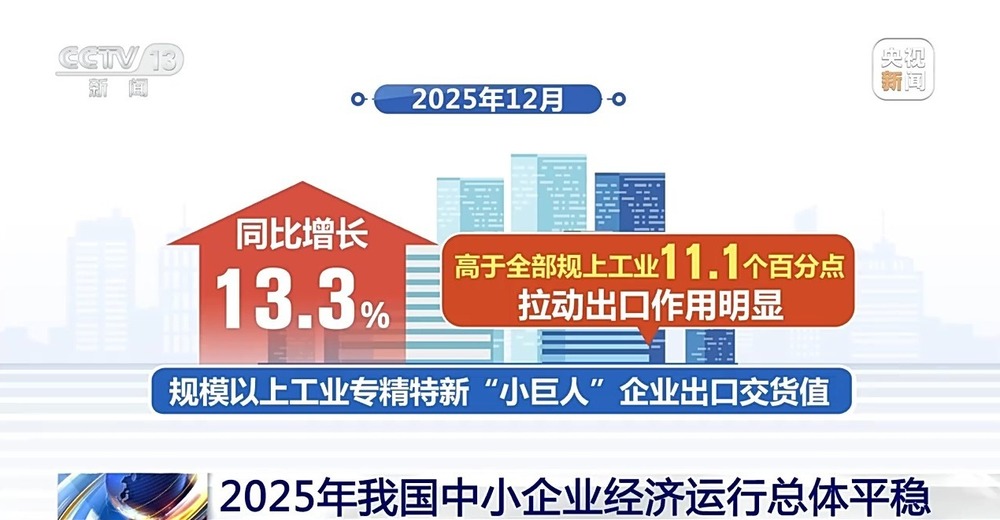 出口方面保持強(qiáng)勁勢頭。2025年12月,中小企業(yè)出口指數(shù)為52.4%,連續(xù)21個月處于擴(kuò)張區(qū)間。規(guī)模以上工業(yè)專精特新“小巨人”企業(yè)出口交貨值同比增長13.3%,高于全部規(guī)上工業(yè)11.1個百分點(diǎn),拉動出口作用明顯。