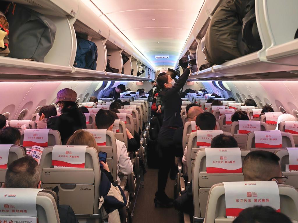 2月5日,國產大飛機C919執飛的東航航班上,乘務員正為旅客放置行李。今年是國產大飛機C919首次服務春運。新華社記者 王聿昊 攝