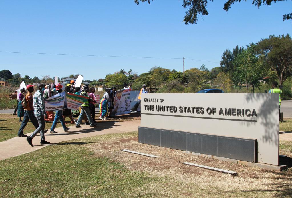 7月4日,在津巴布韋首都哈拉雷的美國駐津使館門前,津巴布韋“廣泛反對制裁聯盟”組織成員舉行抗議活動,反對美國及其西方盟友對津巴布韋的長期經濟制裁。新華社發(塔法拉·穆瓜拉攝)
