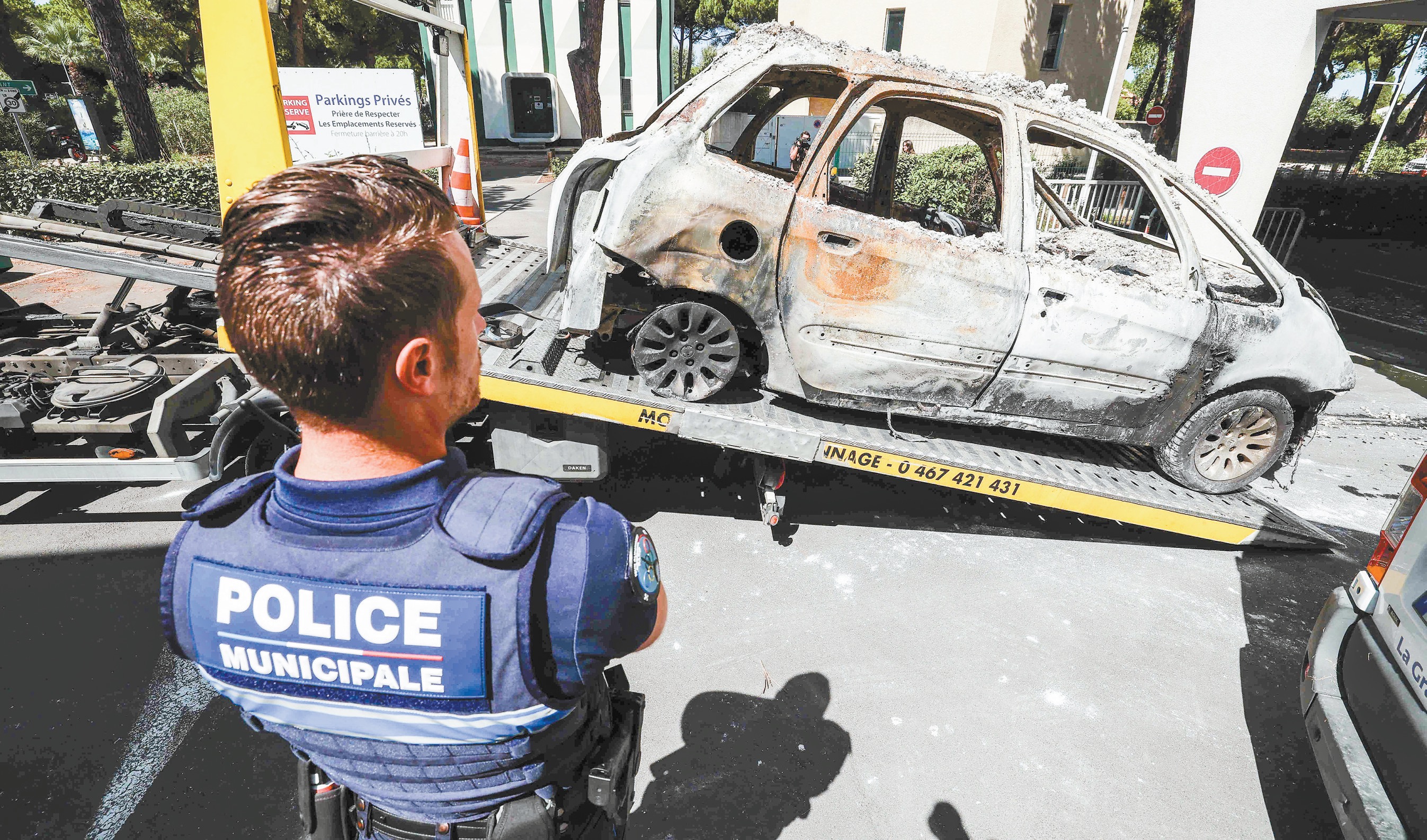 26日,法國拉格朗德默特市一名警察看著一輛被燒毀的小轎車被拖走。當地一座猶太教堂24日遭到縱火襲擊。(視覺中國)
