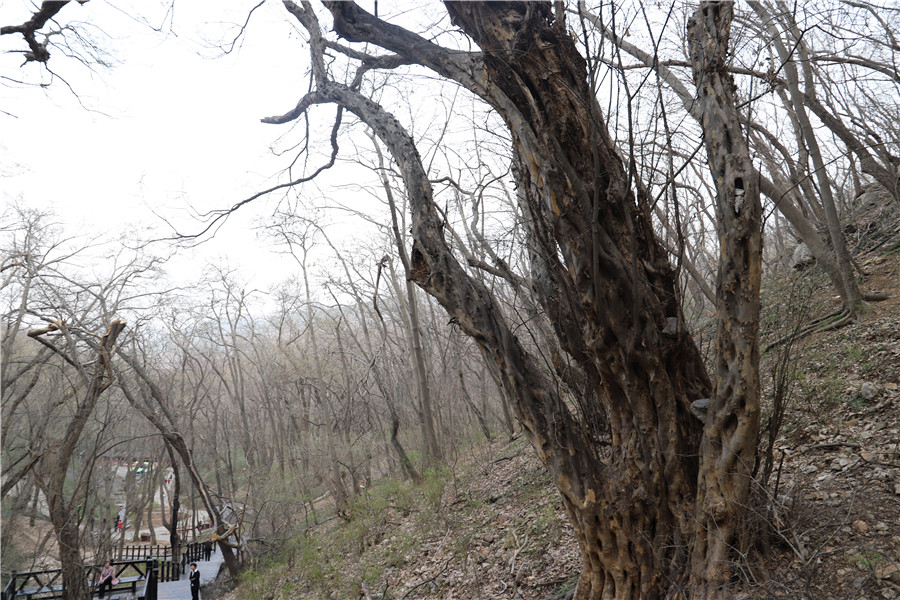 皇藏峪國家森林公園森林覆蓋率為97%,有地球同緯度保存最完好的原始森林,素有“幽谷勝地 天然氧吧”之美稱。這里千年古樹繁多,一路上時不時地就能看到。樹齡1000年以上的古樹名木有1200多棵,黃楊、銀杏、臘梅、桂花、側柏等,尤其是與“黃山迎客松”齊名的古青檀,大自然的鬼斧神工造就了其奇形怪狀,表皮斑駁長滿疙瘩,干形凹凸。樹與樹之間盤根錯節連成一片,有的挺拔雄健、頂天立地,有的駝背弓腰、老態龍鐘。它們盤根于石縫之中,枝高聳天,向世人展示著飽經風霜的歲月痕跡和極其頑強的生命力。